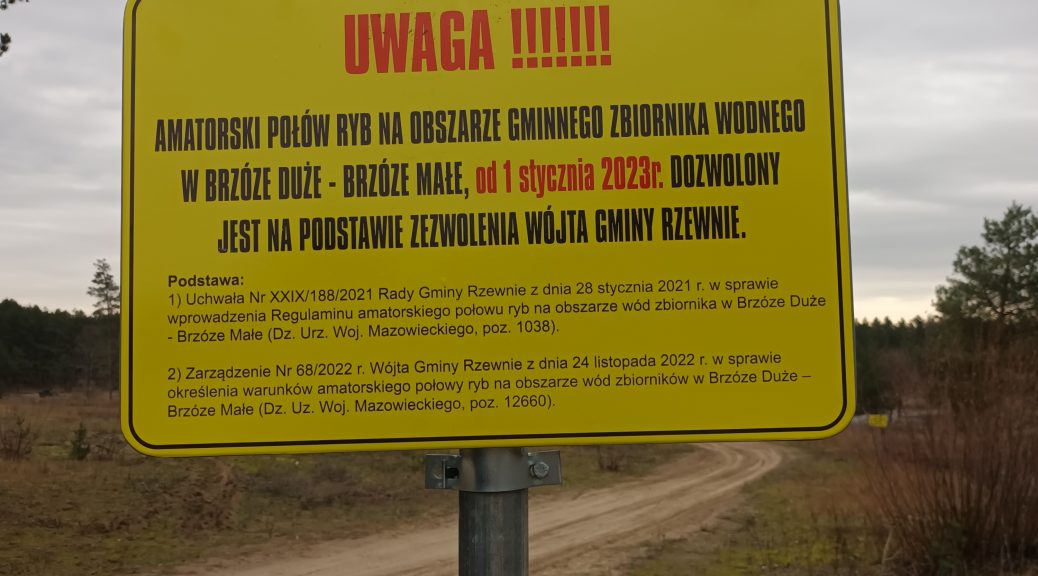 Drodzy wędkarze w miejscowości Brzóze Małe od wczoraj postawiono znaki że amatorki połów ryb dozwolony jest na podstawie zezwolenia wójta gminy Rzewnie. Stanowisko PZW Okręgu Mazowieckiego w tej sprawie jest zupełnie inne. Woda Brzóze A zbiornik od Narwi za mostem jest woda obwodu rybackiego rzeki Narew nr. 6 a dzierżawcą jest OMPZW. Z dokumentów RZGW Warszawa oraz Białystok jakie posiada OMPZW wynika jasno że jest to obwód rybacki rzeki Narew nr 6. Do czasu rozwiązania sporu przez sąd zezwolenia OMPZW jak i Wójta są ważne i można wędkować.